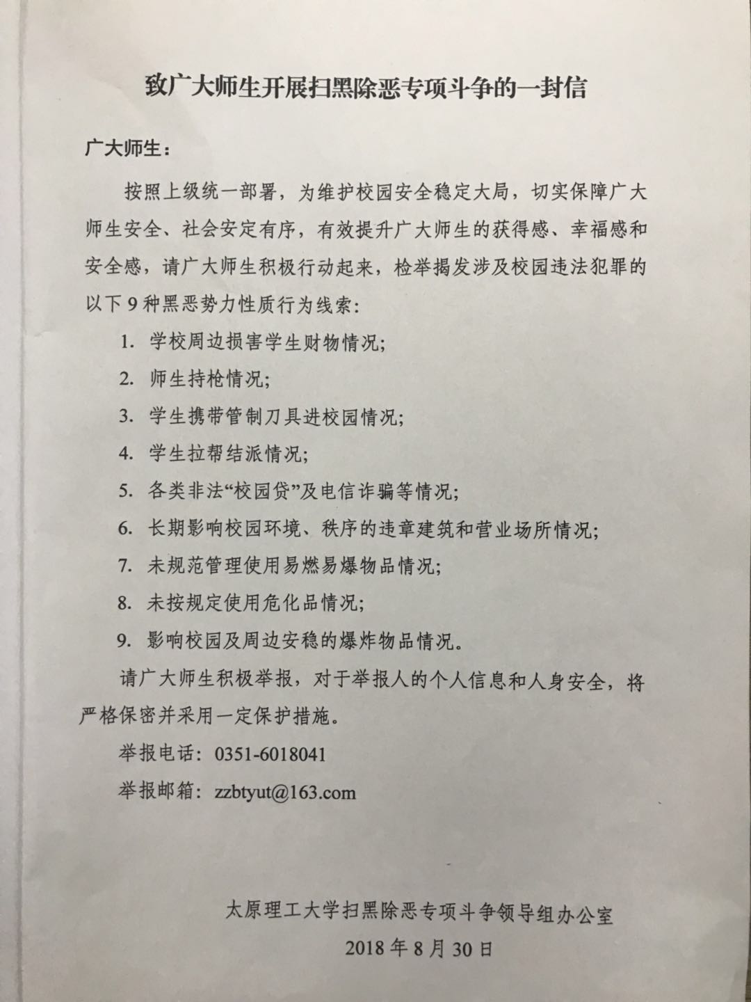 按照上级统一部署,为维护校园安全稳定大局,切实保障广大师生安全、社会安定有序,有效提升广大师生的获得感、幸福感和安全感,请广大师生积极行动起来,检举揭发涉及校园违法犯罪的黑恶势力。
